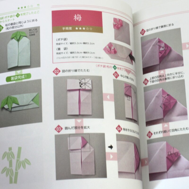 Umschläge , Essstäbchenhüllen und kleine Boxen, gefaltet und mit einer schön gefalteten Dekoration zusätzlich