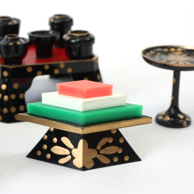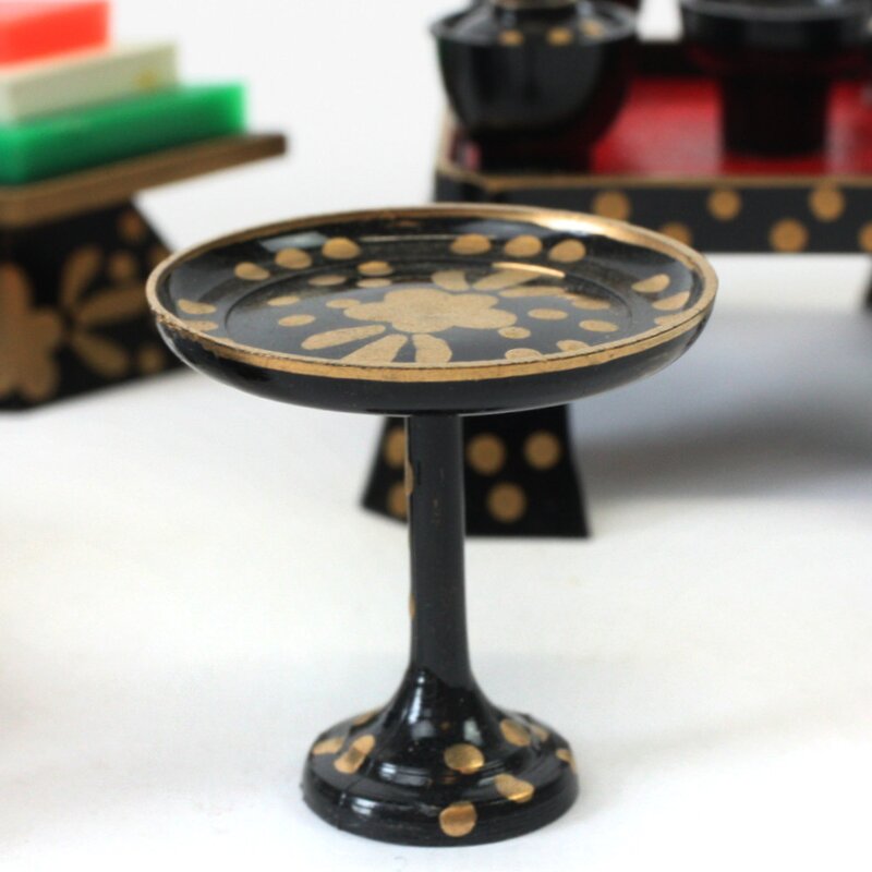 Für Prinz und Prinzessin gibt es jeweils ein Lacktischchen mit Essgeschirr, dazu kleine, runde Beistelltischchen und rautenförmige Podeste für die Mochi