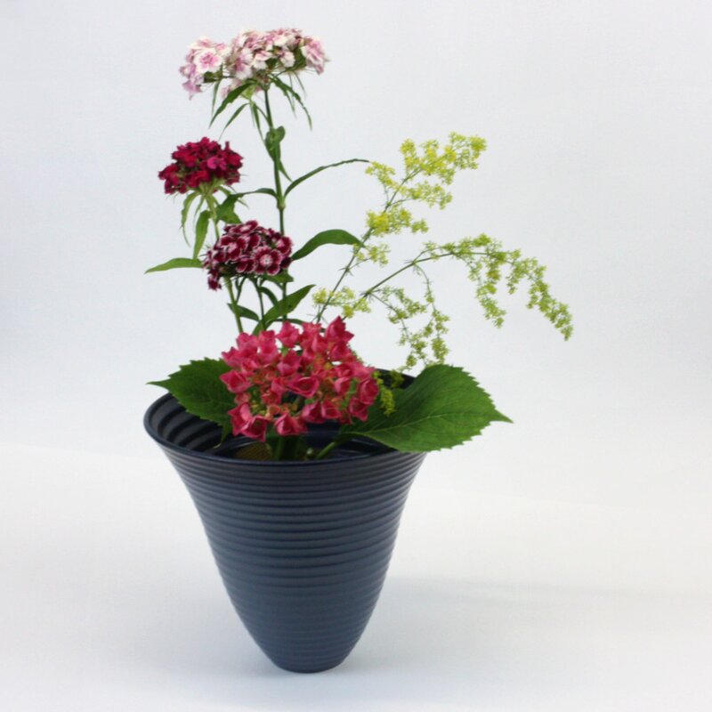 Auf 2/3 Höhe hat die Vase einen festen Einsatz für den Kenzan, es können aber auch lange Stiele in die mittige Öffnung arrangiert werden