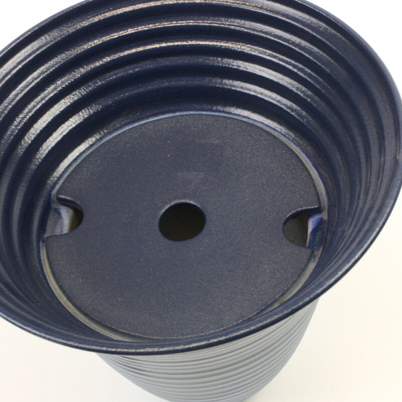 Die konische Form ist am oberen Rand ausladend, die Glasur ist da dunkelblau