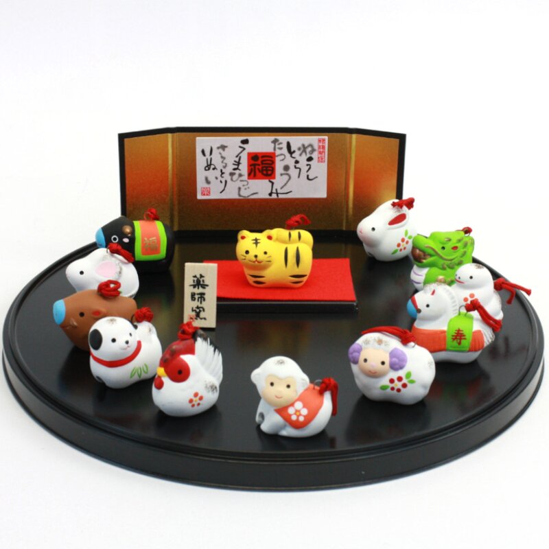 Alle 12 Symboltiere des chinesischen Horoskops sind auf einem kleinen Podest versammelt