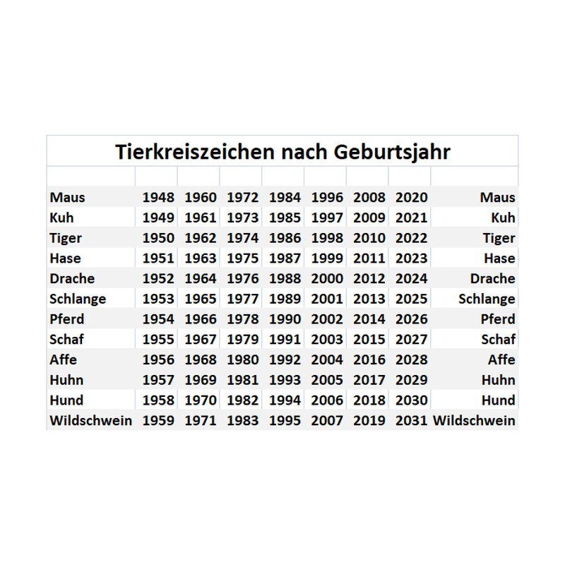 Hintergrund mit dem Schriftzeichen für Glück in der Mitte und den Namen aller Tiere, im Uhrzeigersinn angeordnet