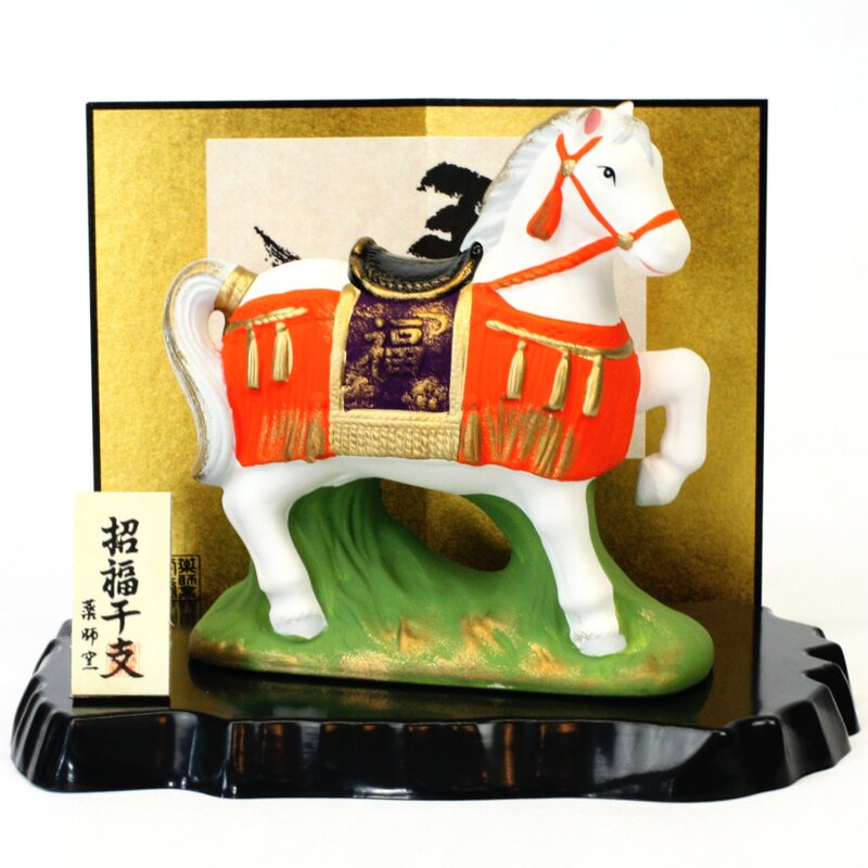 und golfarbenem Paravent mit dem Schriftzeichen für Pferd