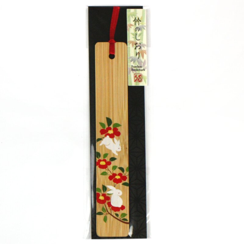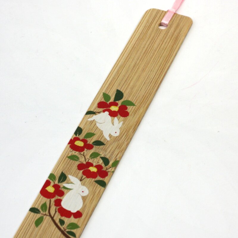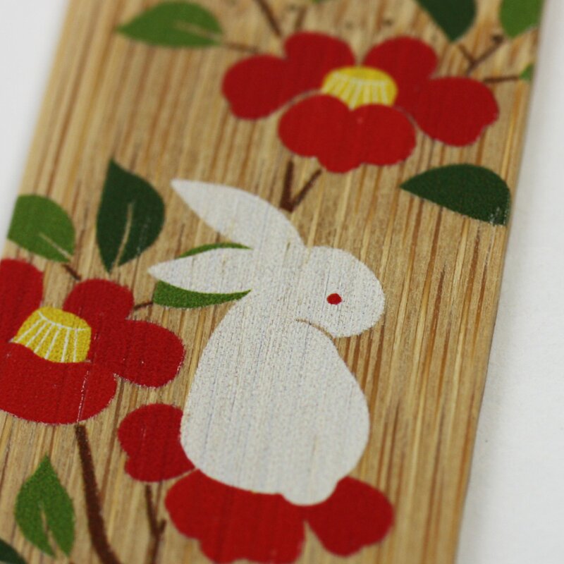 Lesezeichen aus Bambus, bemalt mit Hasen & Kamelien