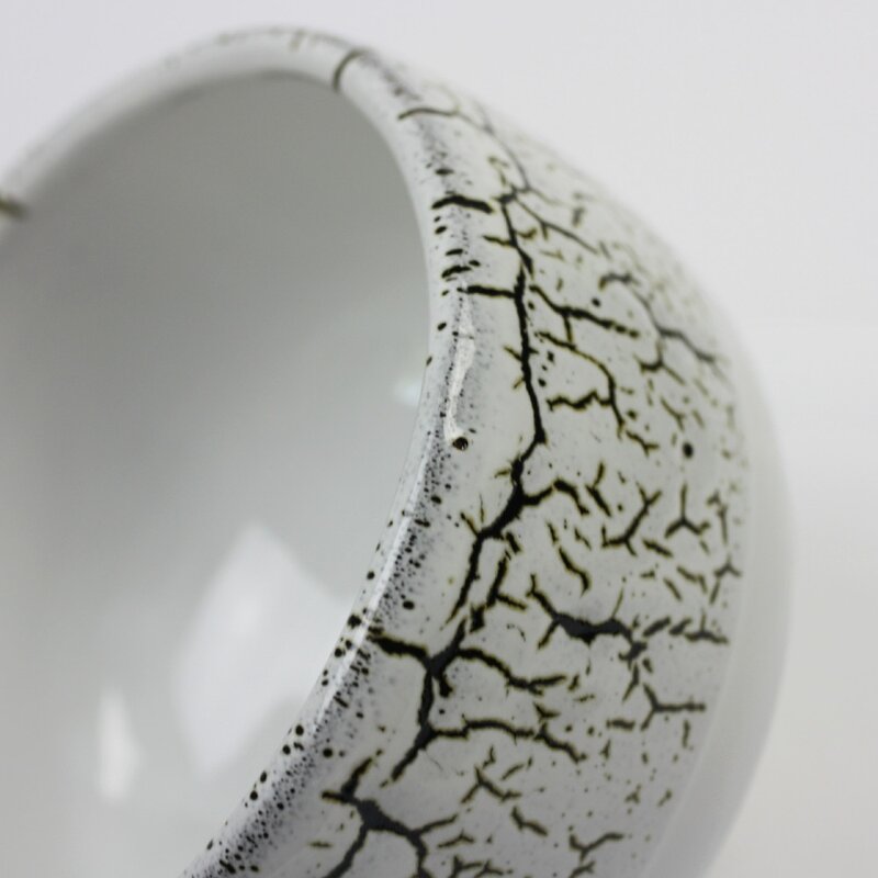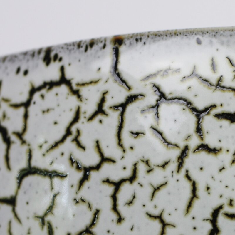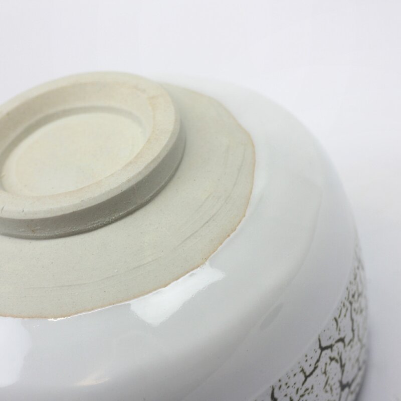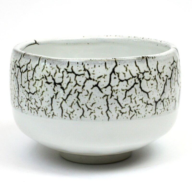 Weiße Macchaschale mit auffälliger craquelleeähnlicher Glasur in der oberen Hälfte