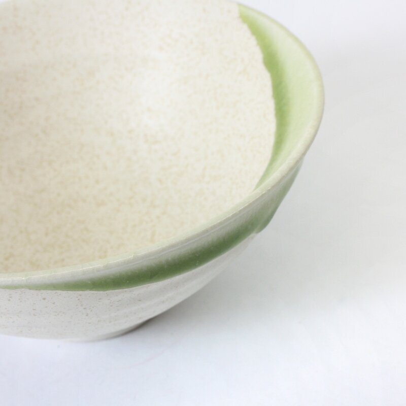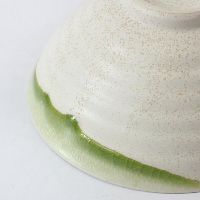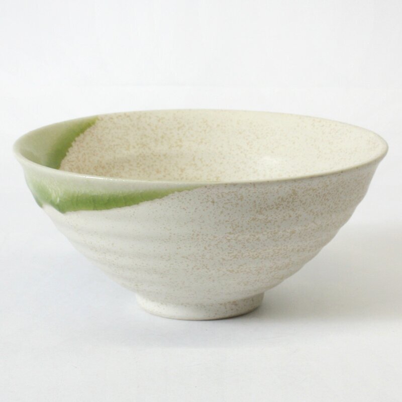 Im Gegensatz zu den üblicherweise bei der Teezeremonie gebrauchten Teeschalen sind Sommerschalen weit ausladend Sie ist matt eierschalenfarben und hat auf einer Seite einen Rand von leicht glänzender grüner Glasur