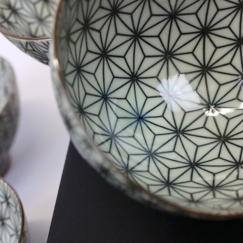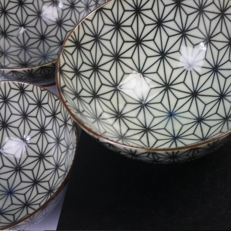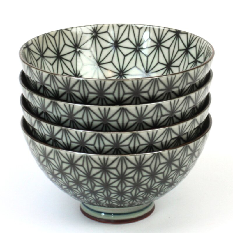 4 Reisschalen im gleichen Muster (Asa no Ha = Hanfblatt)