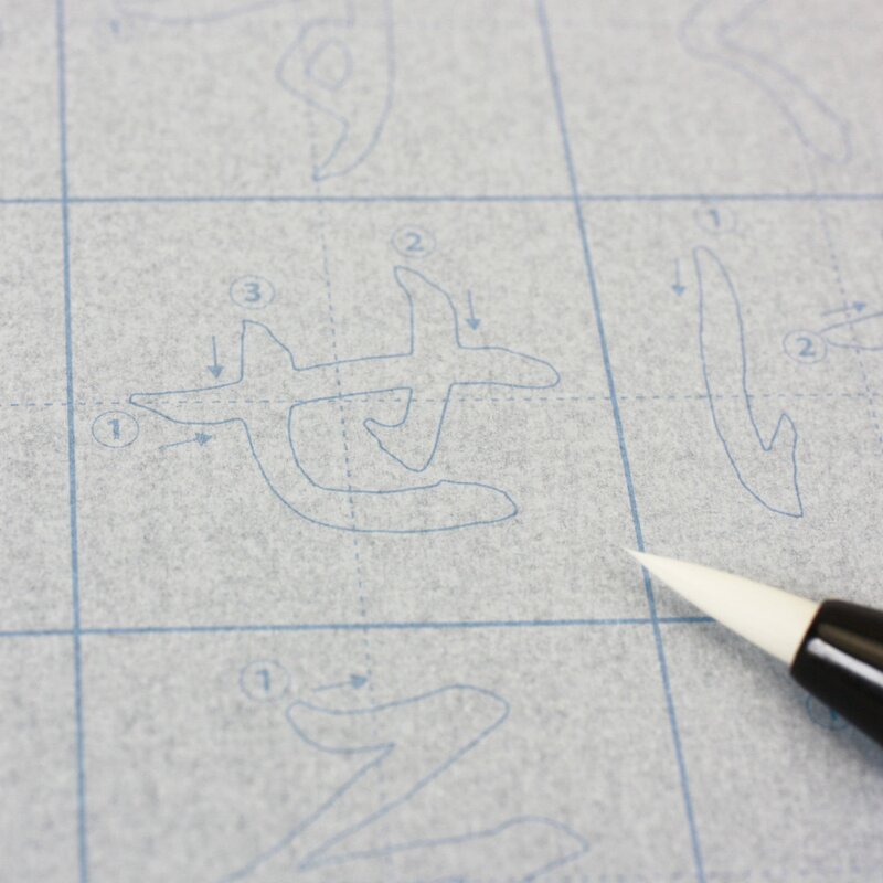 Die Hiraganazeichen sind dünn vorgezeichnet, man zeichnet sie mit Wasser nach und schon erscheinen sie auf dem Blatt, wie mit Tusche geschrieben. Aber nur für kurze Zeit. Sobald sie getrocknet sind, verschwinden sie wieder. So kann das gleiche Schriftzeichen wieder und immer wieder geübt werden, ohne Verbrauch von Tusche oder Papier