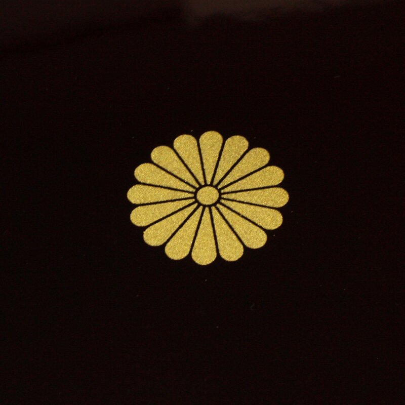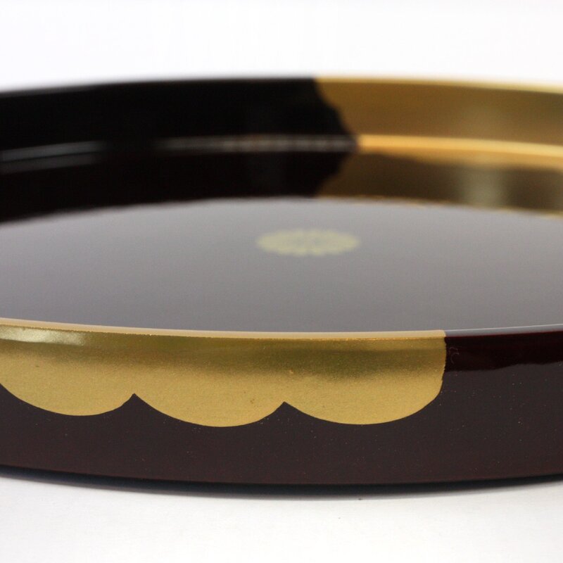 Elegantes japanische Lacktablett mit Blattgoldauflage in Wolkenform und einer stilisierten Chysantheme in der Mitte