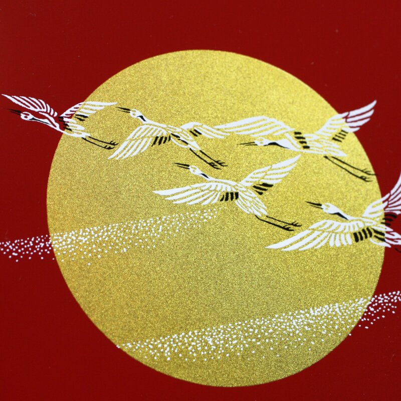 Ein Kranichschwarm fliegt der Sonne entgegen auf diesem Tablett