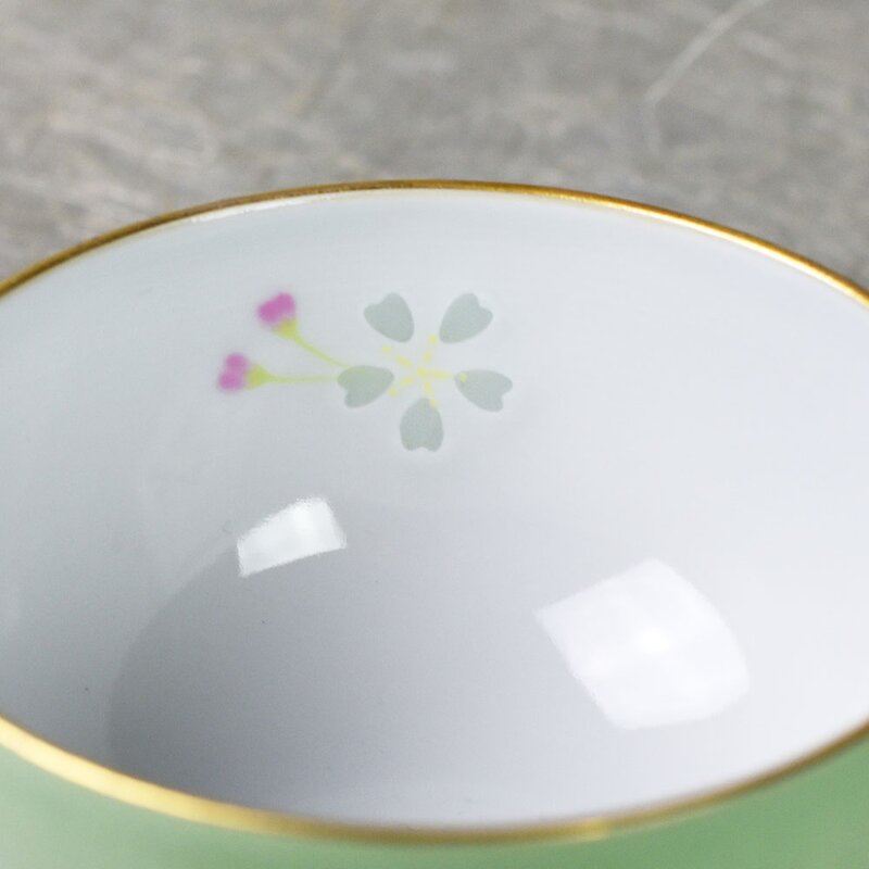 Die zarte Teeschale hat innen und außen ein dezentes Kirschblütenmuster