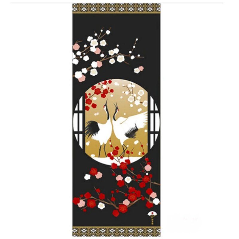 Dieses Kranichmotiv, gesehen durch ein rundes Fenster, verbreitet festliche Stimmung. Rote und weiße Pflaumenblüten und Schneeflocken deuten auf Neujahr hin