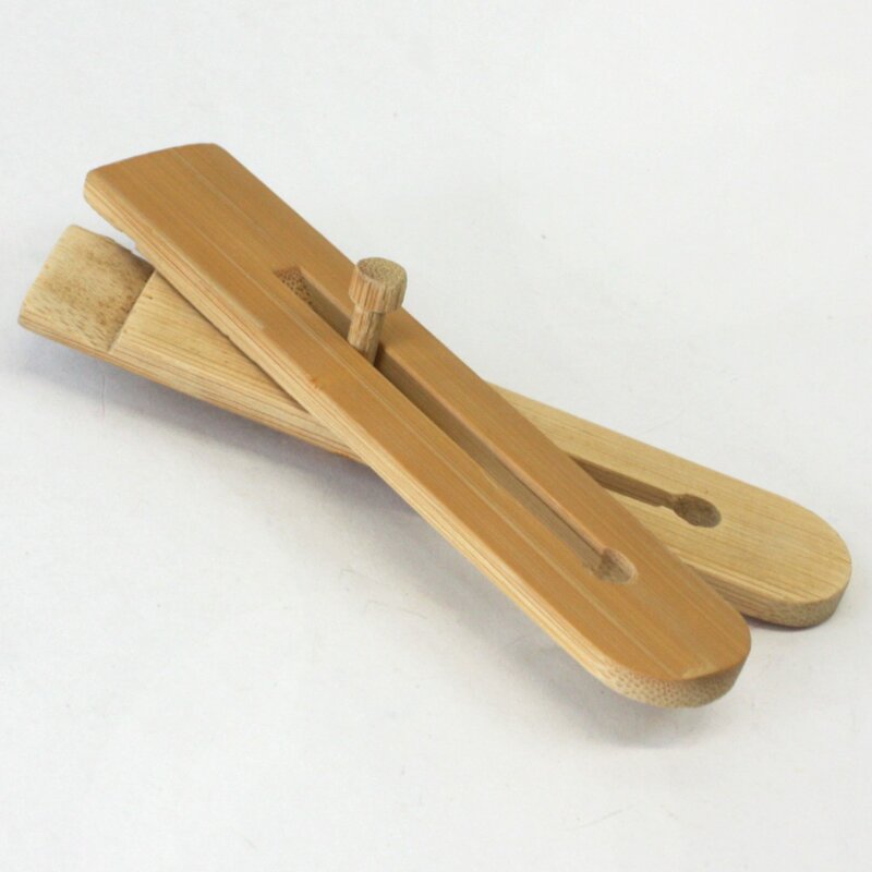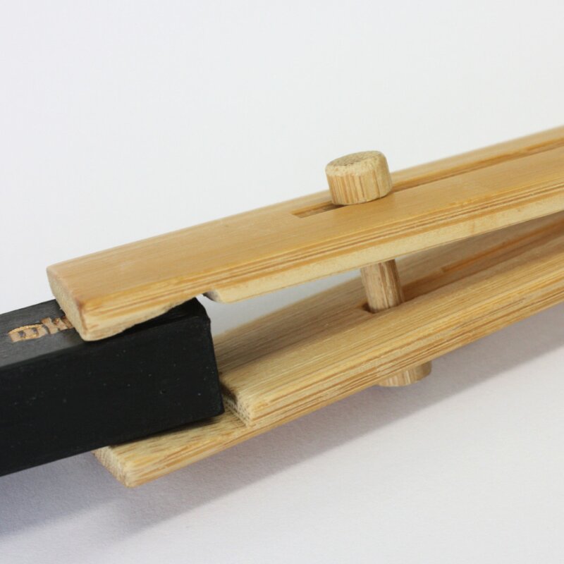 Man klemmt den Tuscheblock zwischen die beiden Bambusstücke und schiebt dann den Riegel nach unten, bis die Tusche fest sitzt